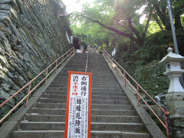 | 結縁厄除け坂。 そのいわれ。 その昔、紀の国屋文左衛門は、若き頃から孝心篤く、母を背負いてこの坂を登り、観音様へお詣りしました。途中草履の鼻緒が切れ、困っているところに玉津島神社の宮司の娘かよが通りかかり、 鼻緒をすげ替えたのが縁となって、二人は結ばれ、宮司の出資金によるみかん船で大儲けしたという、紀伊国屋文左衛門ゆかりの、この坂は結縁坂です。 〜案内板から〜 |