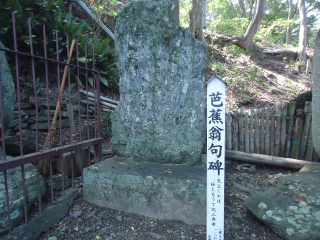 | 芭蕉の句碑 「見上ぐれば 桜しもうて 紀三井寺」 せっかく紀三井寺での花見を期待してきたのに、桜は既に散始めていたのを残念がって詠んだ。 |