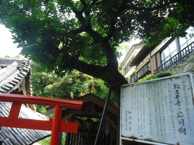 | 応同樹 市指定文化財 病に応じて薬となると云われる樹で、その昔紀三井寺の開山した為光上人が竜宮へ説法に行かれ、龍神からお礼に戴いた七種の宝物の内の一つで、この木の葉を浮かべた水を飲んだり、煎じて飲んだり、或いは首に掛けて置くと病に応じて薬となると云われる霊木です。 |
