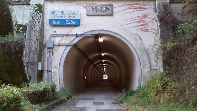 | 老ノ坂トンネル。車道とは完全に分離された歩行者専用のトンネル。旧車道を歩行者用に払い下げた格好の歩行者用トンネルは見たことあるが、歩行者用に掘ったトンネルを見たのは初めて。 |