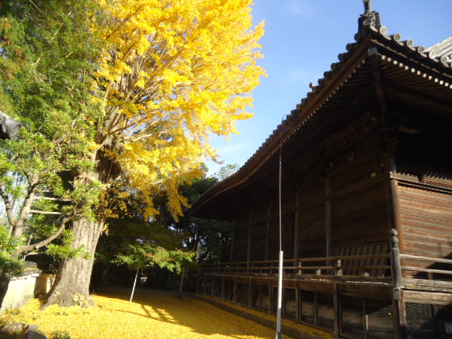 | 「本堂」裏のイチョウ。黄色の厚いじゅうたん。 |