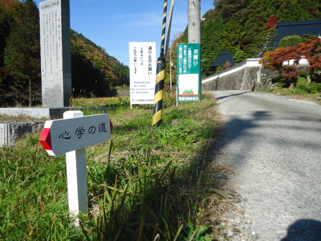 | 13:21 石田梅岩「心学の道」 亀岡市曽我部町寺から東別院町東掛に抜ける古道。江戸時代の偉人「石田梅岩(いしだばいがん)」が京都に赴くときに通ったと言われる道だそうで現在は石田梅岩心学の道(石田梅岩道)として整備されています。 今回のウォーキング。ではこの道は通らず。 |