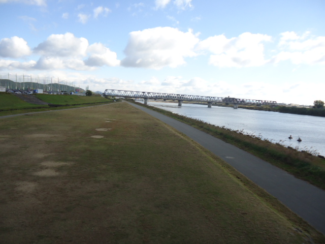 | 加古川を跨ぐ加古川橋から上流側を望む。JR鉄橋の向こうには低めの山も。 | |