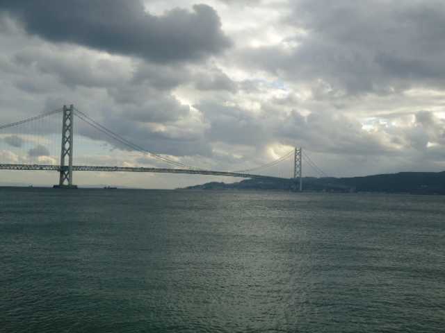 | 明石海峡大橋。全長3911mの世界最長の吊橋。主塔高さ298.3mで支柱間距離は1991m。全長、支柱間ともそれぞれ阪神・淡路大震災で1m伸びてしまった。 橋は水平のように思うかもしれないが吊橋で中央は上がっている。開通前のマラソンで走ったが、路面に立つと中央の路面の上がりはまるで壁のように立って見え、先は見えなかったのを覚えている。 | |