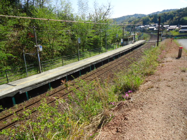 | 9:17 JR小浜線・勢浜(せいはま)駅。東西に走る単線・単式ホームを西から東方面(小浜方向)を望む。 咲き始めのツツジに囲まれた長閑な駅。 |
