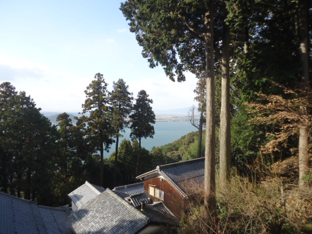 | 杉木立の間から琵琶湖が見えた。 |