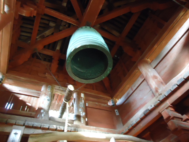 | 鐘楼内の鐘。打ち鳴らす棒はシュロの木。 |