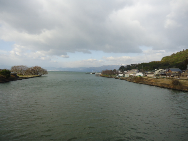 | 9:20 長明寺川に架かる橋より琵琶湖を望む。琵琶湖の奥、比叡の山には雪がかかっている。歩いている時も吹き荒れていた冷たい雪風がもたらしたのもだろう。 |