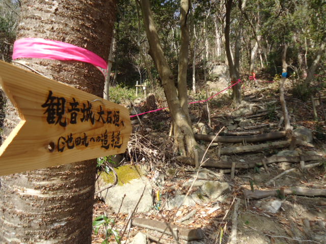 | 13:20 林道繖山線を歩いてきたが、ここから観音城大石垣(池田丸への追手道)へ向かう | |