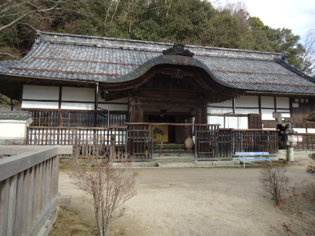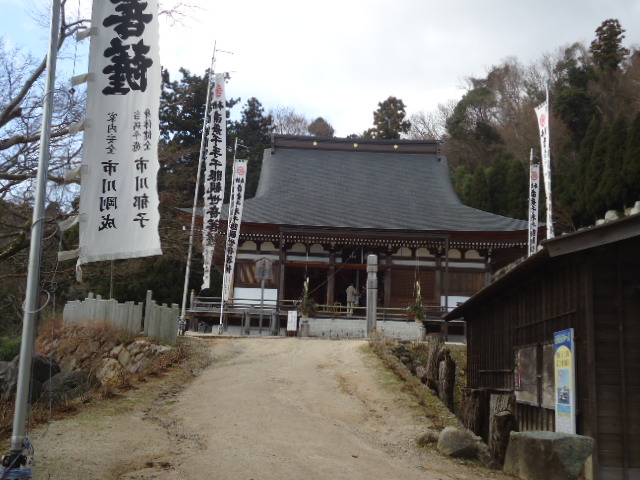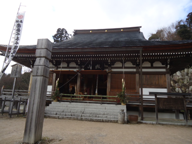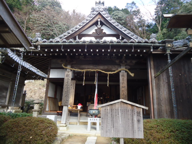 | 本堂 1993年に火災によりに焼失し、2004年に再建されたもの。この火災により重要文化財に指定されていた御本尊である千手観音立像も焼失したため、新たな御本尊としてインドから取り寄せた白檀で造られた千手観音座像を祀っている。歴史的に古い物ではないが、インドの白檀は輸出禁止品であるため本来は取り寄せられない物であるが、重なる住職の交渉の末に特別措置として日本に持ち込まれた。札所本尊は通常秘仏であることが多いがこちらの千手観音座像は常時見ることが出来る。 |