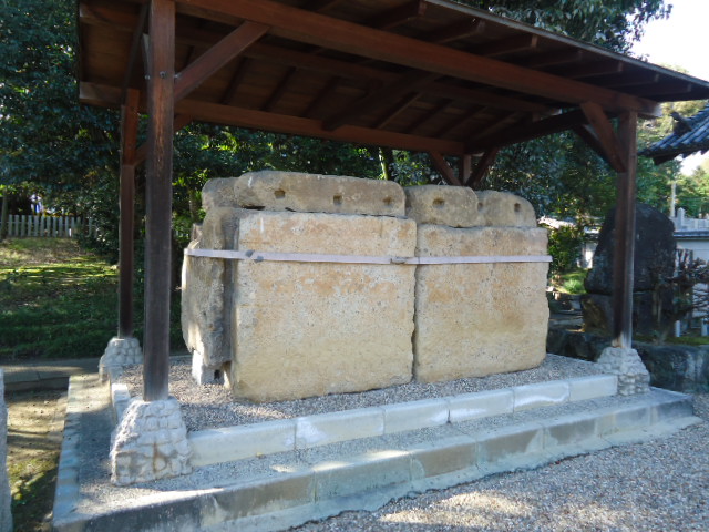 | 12:31 ヒチンジョ池西古墳石棺 野中寺境内に移されて展示してあった横口式組合型石棺 1948年ごろ来目皇子墓西方丘陵上より発見されたもので二上山の凝灰岩の切石で構築されています。 側面・上面・底面には二枚づつの、奥壁と入口部分には各一枚の切石が使用されており、入口の石は扉になっています。 いわゆる『横口式石槨』といわれる形式に属し、大和飛鳥の高松塚古塚の横口式石槨と似ています。 制作年代は、七世紀中頃と推定され、発見場所から羽曳野丘陵一帯に居住していたとみられる王氏一族(葛井・船・津) にゆかりのある人物の墳墓であろうと推定されています。 |
