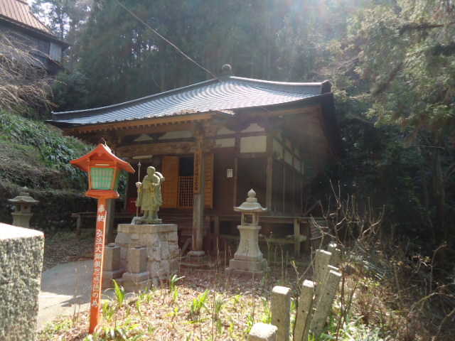 | 藍染堂 かつて、勤操僧正がこの寺に住んでいるとき、空海(弘法大師)が訪れてきて、寺で修行し、この場所で剃髪し得度したという。愛染堂の前には、「弘法大師御剃髪所跡」と銘のある石碑、「弘法大師報恩感徳の為」と書かれた灯籠が建てられている。 |