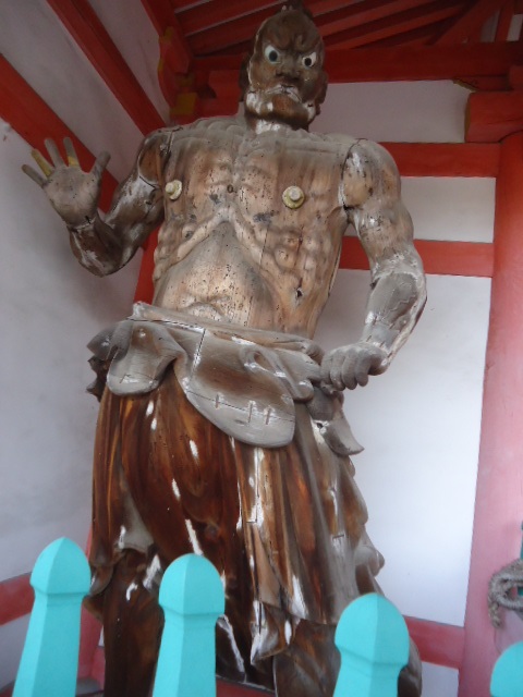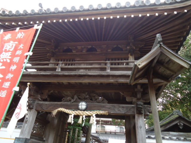 | 14:42 犬飼山・転法輪寺 山門。 鐘楼堂を兼ねた造りになっている。赤い紐が見えるが、これを引くことで鐘を鳴らせる。前の人に習って引いてみたが、良い鐘の音が響いた。 |