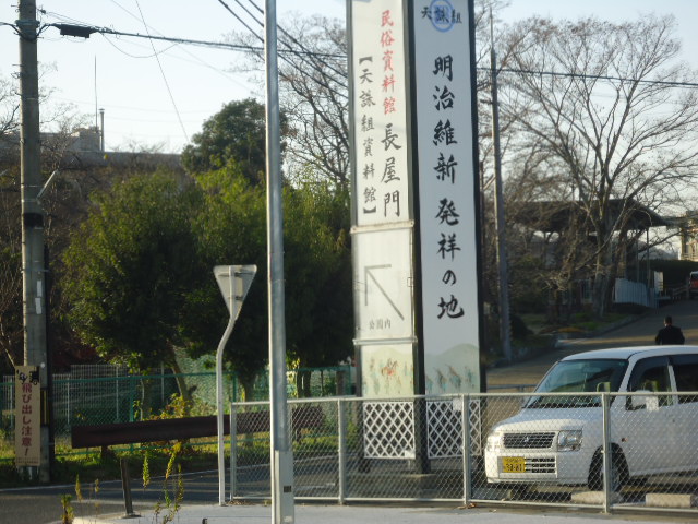 | 15:17 「明治維新発祥の地」の立て看板。 幕 末の1883年、京都朝廷において尊王攘夷の断行を祈願するための“大和行幸”が決まった。これを機に一気に倒幕を果たそうとする中山忠光・吉村寅太郎ら 尊皇攘夷派の一部が、行幸の先鋒となるべく大和に入り挙兵して「天誅組」を名乗った。五條代官所を焼き払い、ここを「天朝直轄地」として近くの桜井寺を本 陣として「五條仮政府」と称した。 ところがこの直後、京都では政局が一変し、尊攘派の排除され大和行幸は中止。天誅組は大義名分を失い、一 転して“暴徒”として追討が命じられた。幕府も天誅組追討を命じ、1000人ほどの天誅組に対して1万人を超える追討軍にには手も足も出せず、挙兵から 1ヶ月余りで壊滅した。 皮肉なことに、このこの“天誅組の変”の5年の後に、明治維新が実現している。 五條においては、天誅組は幕末における下級武士らによる最初の武装反乱であり、倒幕・明治維新のさきがけとなる歴史的な“義挙”であるとして、「明治維新発祥の地」として記念碑を建立した。 明治維新のような歴史的な現象は、諸々の出来事や社会情勢などの混沌とした組み合わせの中で発生するもので、特定の事象から始まった(=発祥した)というのは相当な無理があるが、五條市は大真面目である。 発祥の地コレクション HP より転載させていただきました |
