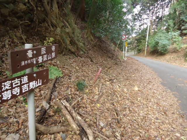 | 10:14 大淀古道の壺坂峠を通過中。 手前側は 下の看板に示される: 世尊寺 吉野山 向こう側はこれから向かう: 壺坂寺 |