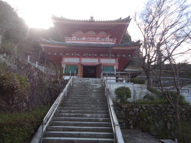 | 14:42 犬飼山・転法輪寺。 弘法大師は、留学先の唐の国から日本に向けて三鈷を投げ、落ちたところに密教の修行場を建立すべく志を立てたと伝えられます。帰国した弘法大師が弘仁7年(816年)京を立ち、三鈷の落ちたところを探して大和の国宇智郡にやってきたところ、狩場明神と出会い高野山を開くことができました。この故事を後世に伝えるため、弘法大師と狩場明神の会見の地宇智郡(現在の奈良県五條市)に創建されたのが、犬飼山転法輪寺です。 |