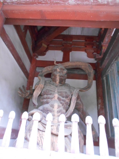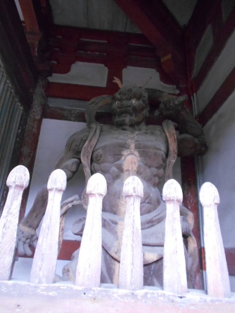 | 楼門 道路側から見た。 羽根を広げ、今飛び立とうとする鳥のような軽やかな楼門。これは「水平のない軒反り」の技が造り上げた雅の美しさ。屋根の長い方、短い方ともに同じ曲線にする工夫は類例がない。楼門の正面から見上げて、より大きく見せようと、仁王尊像を中心柱線より後方に置位して前面を広くした工夫も珍しい。柱上の斗?、通路上の意匠を異にする三種の蟇股。先端が平らで先細りしない尾垂木等の和様に、木鼻や、正面の紅梁などの唐様建築の特徴を取り入れた優れた技が見られる。室町時代初期応永年間(1394〜1428)建立と伝える「最も美しい楼門」と評価される文化財。 |