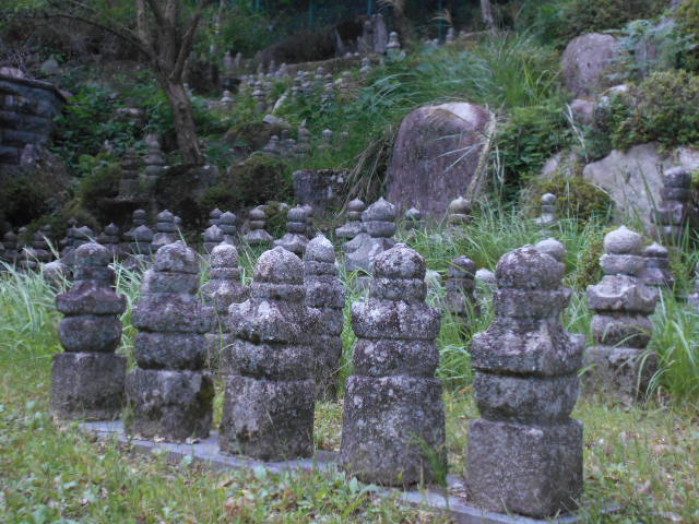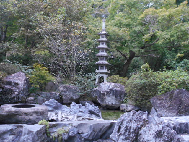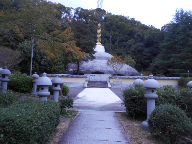 | 仏塔 五輪塔の庭 「森羅万象」 「大自然」 それは「真理」。「ベイロシャナウ」 「昆蘆舎那」という。「〇?Δ〇□」の五つの形で説く。「空風火水地」の五大相、自然の実相。即ち「陽光、空気、水分、大地」 この大自然の偉大なる実相こそ「生命の本源」 すべてを生かす源。大自然の恵みである。 仏教はこの自然の実相の中に「知恵と愛(慈悲)の意識の営みを悟った。加えて六大とし、「摩訶昆蘆舎那仏」 「遍照金剛」 「大日如来」 として拝む。 仏になって尊く生きよう 大自然の命は尊いから。そして 大自然の命に帰ろう 大自然の命から生まれ育ったのだから。 亡き人のみ霊を大地浄土に帰えし。時を経て塔の尖端から昇天する弥勒如来のトソツ天である。光明は恵みとなって大地を満たし生きとし生ける者を包む「五輪塔」を建てこれを願う。万民の願いであり、これが祈りである。 み恵みの あまねき光明 地に満ちて 菩提の花は 咲き匂うなり 説明板から |