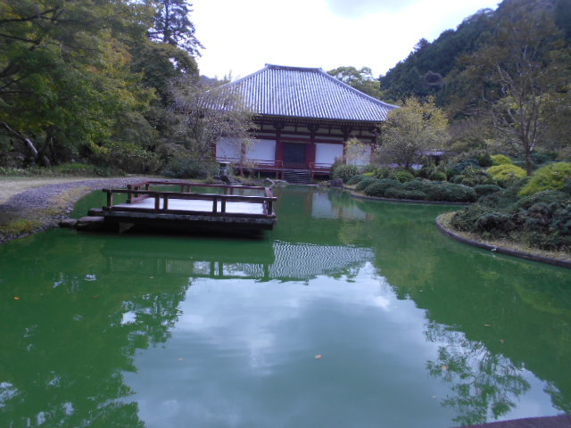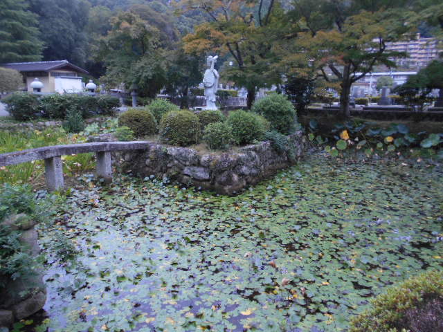 | 朱雀池 自然にできたこの池がこの寺の起源。725年、行基菩薩はここにたどり着かれた。妙なる音楽と共に紫の雲がわき、この池から、閻浮壇金(えんぶだこん)の小観音を感得。聖武帝の頼願で、安養院開創と伝える。 水蓮、蓮の花が美しく埋める。 南に朱雀池 西に白虎岳 北に玄武岳 東に青龍川 四神相応の中心に、金堂が建てられた。 説明板から |