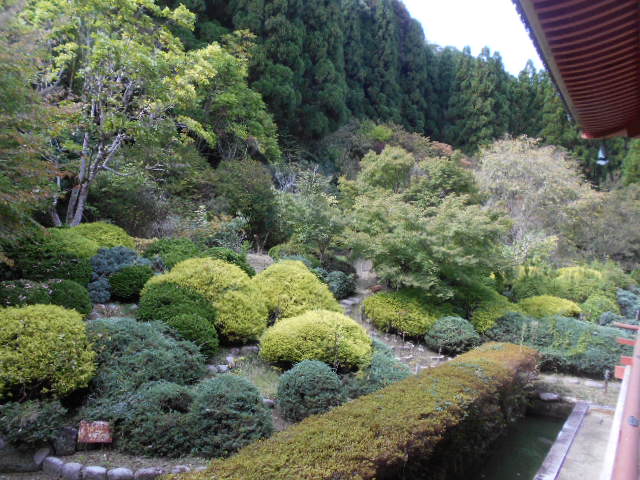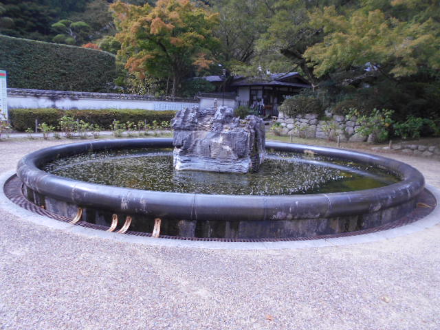| 具足池 「吾、唯、足るを知る心」 「不足感を捨てて、不満を口にしないで」 と、まんまるい池からあるれる水が言う。岩上の修行大師に迎えられ、送られて、参拝者は「合掌」自分を拝む。その向こうに本堂。「ありがとうございます。」とみんなにお寺の中では、会った人に挨拶を。 説明板から |