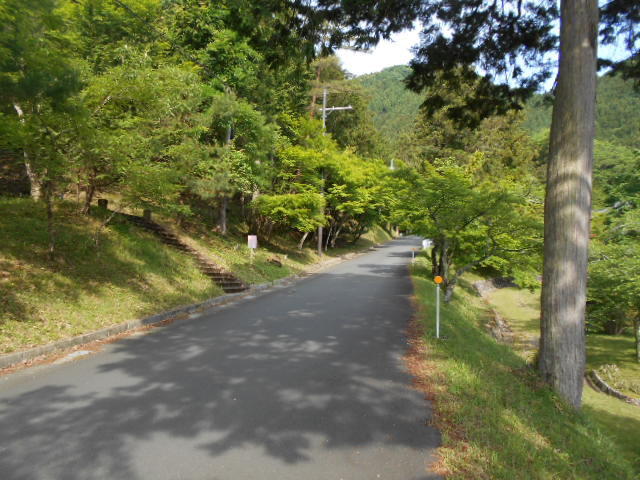 | 山門手前の駐車場に至る道は緑に囲まれている。 |