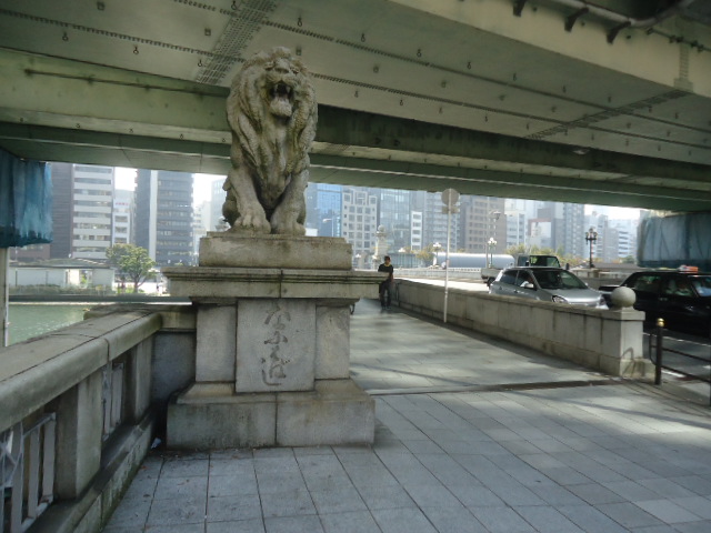 | 大川に架かる難波橋。変体仮名か?読めないが、・・・・ 上に架かるのは阪神高速環状線。東京では河川の上空に架かる道路を地下の道路にし美観を取り戻そうとしていると聞くが、大阪では全くそのような話は聞かない。 |
