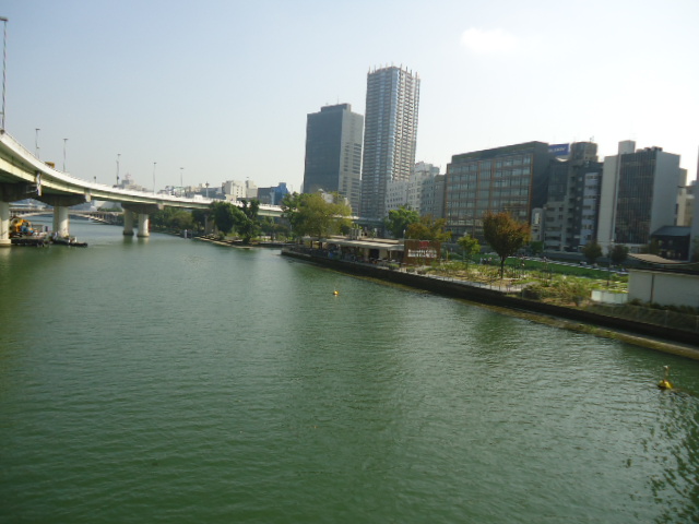 | 中之島の上流端あたりにも高層ビルが林立してきた。工事中の中央のビルもどこまで伸びるのやら。 |