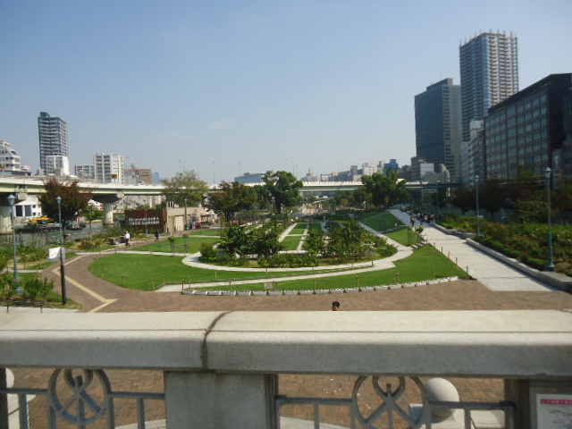 | 中之島公園のバラ園が見える。 |
