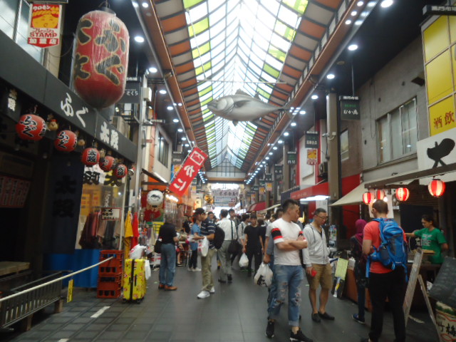 | 黒門市場。ウロツイているのは中国人観光客ばかり。市場と言っても品は良いようだが、値段がべらぼうに高い。観光客目当てになってしまい、庶民の市場ではなかった。 |