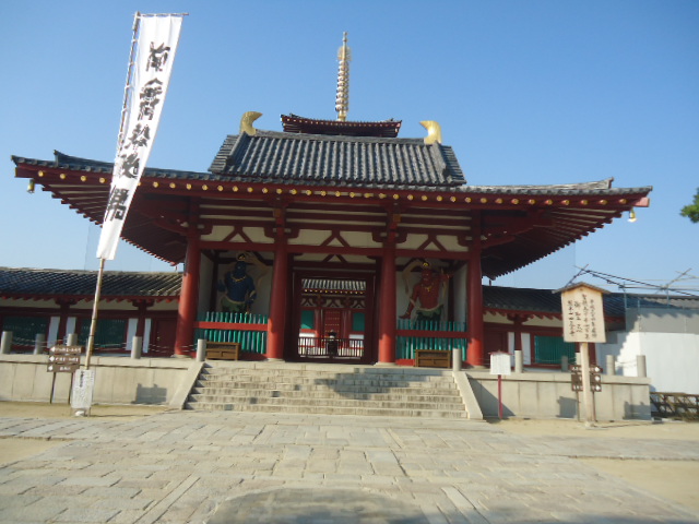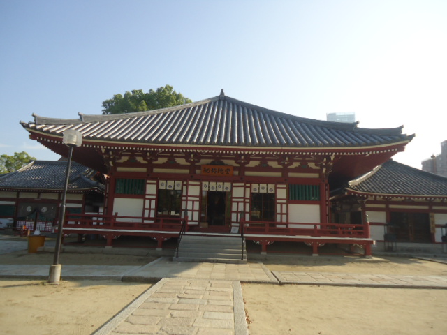 | 金堂 聖徳太子のご本地仏である救世観音をお祀りし、四方を四天王が守護しています。毎日11時より舎利出しの法儀が厳修されます。南無仏のお舎利を以て、ご先祖のお戒名(霊名)が書かれたお経木にあてられ、又参詣者の頭にあててもらおうと多くの信者さんが参詣されます。 〜案内板から |