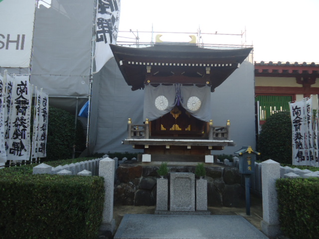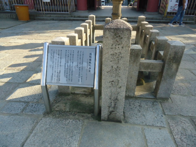 | 熊野権現礼拝石 平安・鎌倉時代に盛んであった熊野詣りの道筋は、京都の宇治から大阪の天満まで淀川を船で下り、天満から四天王寺・住吉大社・和歌山の田辺を通るもので、熊野街道と呼ばれた。四天王寺の西門信仰と同じく、熊野三山が極楽往生を願う浄土信仰の聖地として篤く信仰されたことから、 人々はまず当山に詣でた後、ここで熊野の方向に礼拝し、熊野までの道中安全を祈ったといわれる。 〜案内板から |