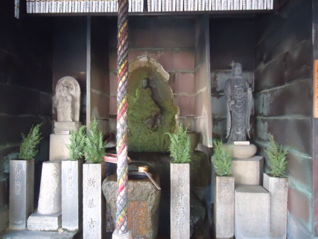 | 亀井不動尊 本尊は水掛け不動尊、左に子育て地蔵尊、右に延命地蔵尊 |