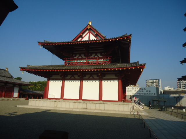 | 番匠堂 このお堂は、日本における大工技術の始祖として番匠(大工)達から尊敬されている聖徳太子を祀る。曲げ尺を携えたそのお姿より世に曲尺(かねしゃく)太子といわれている。四天王寺は推古天皇元年(593年)に、聖徳太子が創建され、その際、伽藍建立にあったっては百済より最新の番匠の技術を招来された。 また、聖徳太子は七堂伽藍の建立にはやむをえず大地の産物の命を絶ってしまうので金鎚、鋸、錐などに仏生をいれて番匠器(大工道具)で「南無阿弥陀仏」の名号を書かれ、大工の工事安全と伽藍の無事建立を祈ったと伝えられている。 文化国家日本の先駆けとなった四天王寺伽藍の建立は聖徳太子並びに番匠の人々の叡智とたゆまぬ努力の賜物であり、その偉業を顕彰し併せてあらゆる建築にたずさわる人々の守護のため、ここに番匠堂を建立するものである。 〜案内板から |