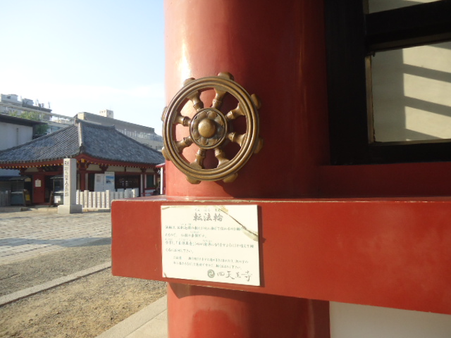 | 西大門の内側門柱に設けられた転法輪 参詣者はこれを回転させ、直接法門に触れることにより、洗心の功徳を積むことができる。また、転法輪とは、釈迦如来の説法が過去現在未来と無限に続くことを表しており、仏足石・菩提樹と並んで、仏陀(悟れるもの)の象徴とされている。 〜案内板から |