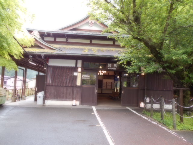 | 叡山電鉄・鞍馬駅 左側が無人改札で、今は自動改札もなく駅員もいないので、ワンマン運転の運転手に切符を手渡し。 右側は待合室を兼ねた展示室。レトロな感じの駅舎は風情があって良いものだった。 |
