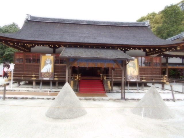 | 上賀茂神社 立砂と細殿 立砂(たてずな) 盛砂(もりずな)とも云い、「たつ」とは神様のご出現に由来した言葉であり神代の昔ご祭神が最初に降臨された本殿の後2kmにある円錐形の美しい形の神山(こうやま)に因んだもので一種の神籬(ひもろぎ)即ち神様が降りられる憑代(よりしろ:依代)である。鬼門・裏鬼門にお砂を撒き清めるのは此の立砂の信仰が起源で「清めのお砂」の始まりである。 細殿(ほそどの) 寛永5年(1628)造替 重要文化財。行幸の際及斎王の御著到殿。創建年代不詳。正暦5年(994)5月23日官符にその名始めて見ゆ。 |