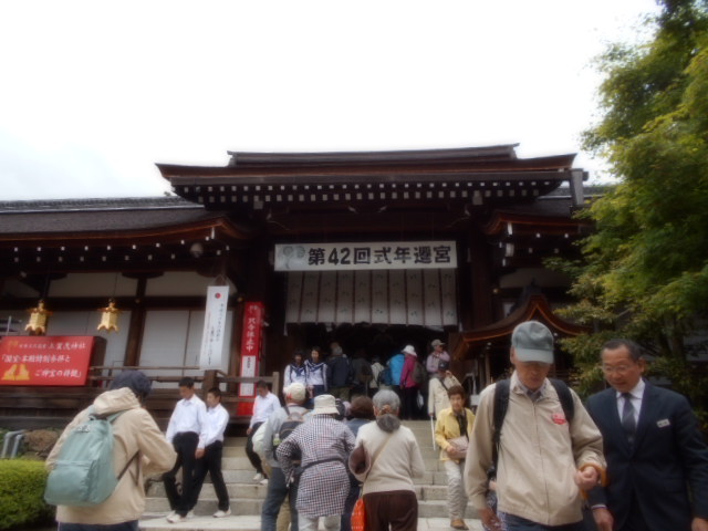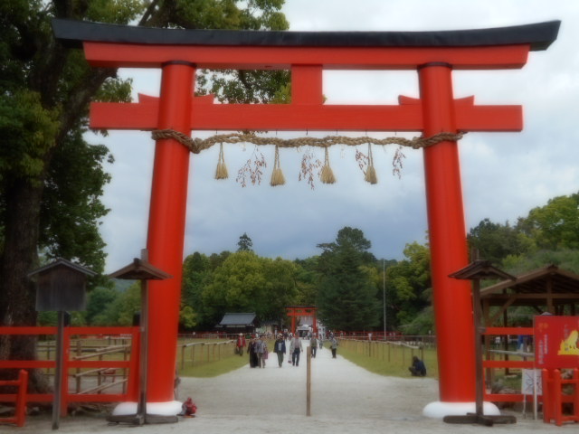 | 上賀茂神社の中門 第42回式年遷宮の大きな看板が出ている。 式年遷宮 式年遷宮は、神社本殿の造営・修理にあたって、神体をこれまでとは異なる本殿に移すことを指す(式年=21年毎に、遷宮=神体を移す)。今回も、国宝に指定されている本殿(1863年建造)と権殿(同1863年)、重要文化財(建造群)に指定されている楼門(同1628年)などを修復する。 |