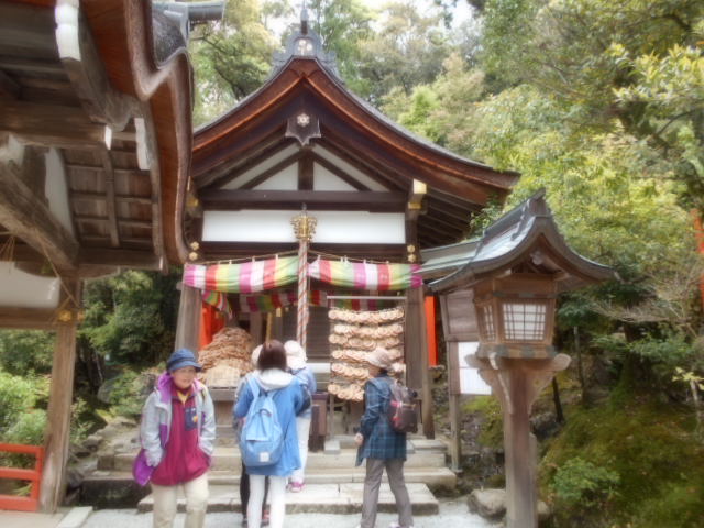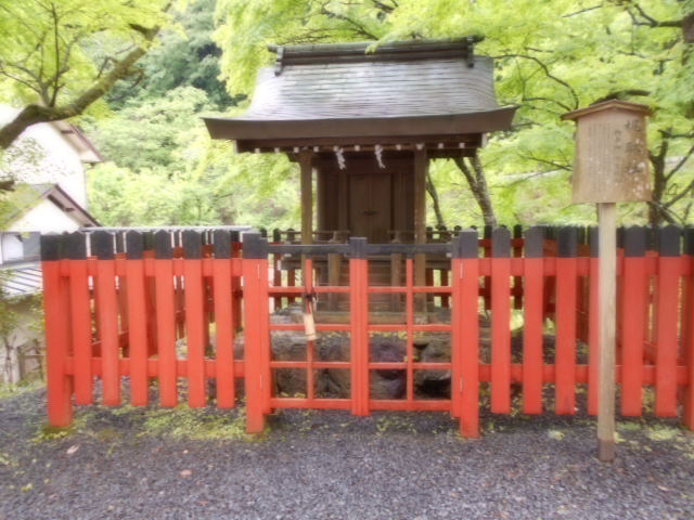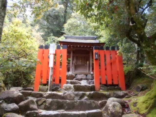 | 梶取社: 貴船神社の大鳥居横に祭られています。 案内板には御祭神:宇賀魂命とあるが、ふるくからの言い伝えでは「梶取大神」だとか。貴船神社創建の伝説に出てくる「玉依姫命が乗った黄色い船」を巧みに操舵した神のことであり、それゆえ同社はいまも、航海安全や交通安全を願う人々の尊崇を集めている。 |