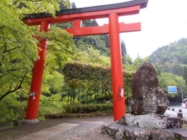 | 叡山電鉄・貴船口駅近くの三叉路に立つ貴船神社の大鳥居。神社まではここから貴船川に沿ってまだ2キロメートルほど遡らなくてはならない。 |