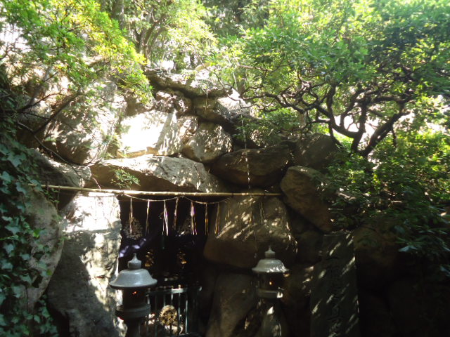 | 岩屋の奥には「一願堂奥の院」と書かれた石碑があり、岩屋の上から細い細い水が滴り落ちている。夜にお参りすると一層、神秘的な雰囲気を味会うことになるのでは? |