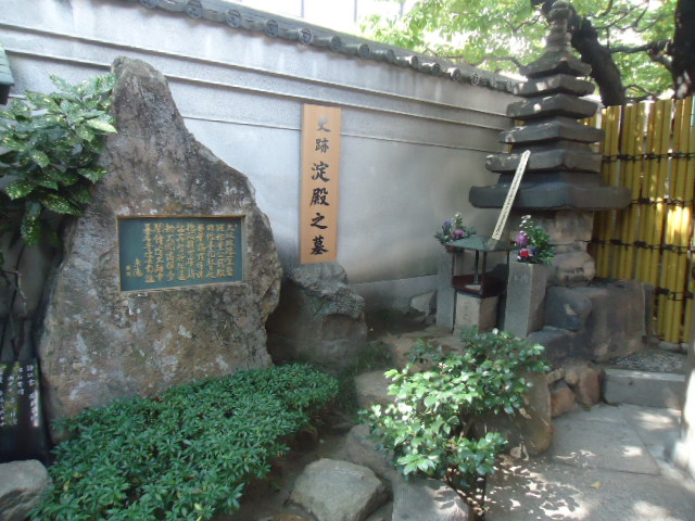 | 史跡 淀殿の墓 淀殿は浅井長政の長女で母は織田信長の妹お市の方である。後に、豊臣秀吉の側室となり、秀頼を生む。秀吉亡き後は大阪城で豊臣方の中心人物になるが、大阪夏の陣で戦いに敗れ、秀頼と共に自刃した(1615年)とされている。 現存の墓は六重の石塔であるが元は九重の塔だったといわれている。この石塔は太平洋戦争時の空襲に遭っているが、大きな損傷をうけなかったようである。ただ、九重の塔であったのが六重の塔になったのは空襲による破損と思われる。 当初、淀殿の墓は現在の大阪城公園内にあったようであるが、明治10年(1877年)に現在の場所に移されたという。 |