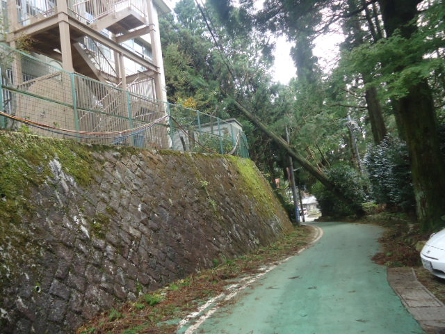 | 道路左の六甲山小学校側に倒れ掛かっている杉の大木。この大木が倒れるとは。山頂付近ではどれだけの風が吹いたんだろうか。 |