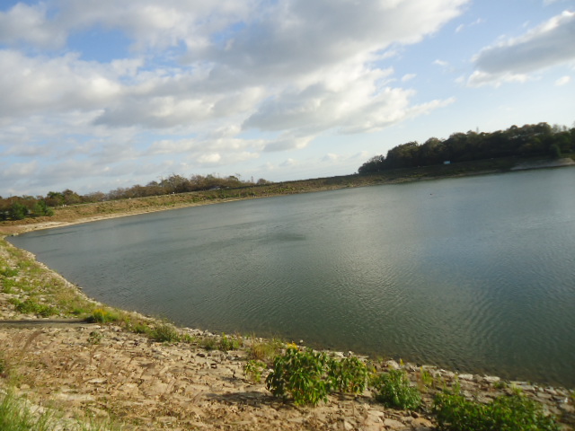 | 北山貯水池。多目的の水源としてダムは必要とは思うが、住宅地間近にこれだけのダムを作って大丈夫なんだろうか。貯水量:約100万トンの堤が地震で崩れれば、鉄砲水が真下の住宅を急襲する。犠牲者は何万人? 何十万人? 満水のバケツを頭の上に乗せている人たち、不安はないですか。 |