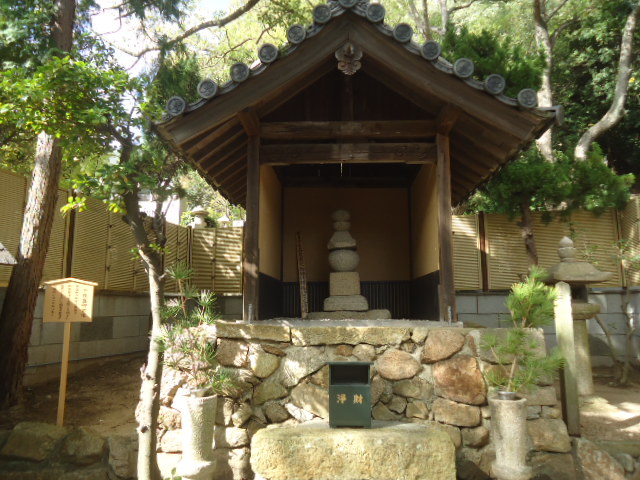 | 菅原道真公の手植えの松 横に「菅の井」 「伝説によれば、901(延喜元年)年、菅原道真が九州大宰府に流される途中、風波を避けて須磨に一時上陸した際、、浦人が漁網の大綱を巻いて円座をつくり、道真に休んでいただいたといわれています。その時に西須磨の旧家である前田家の人が井戸の水をくんで差しあげたところ、道真は大いに喜び自画像を前田家に与えたそうです。前田家は、この井戸を「菅の井」と名付け、その水で銘酒「菅の井」を作って毎年大宰府天満宮へ献上していたと伝えられています。 |