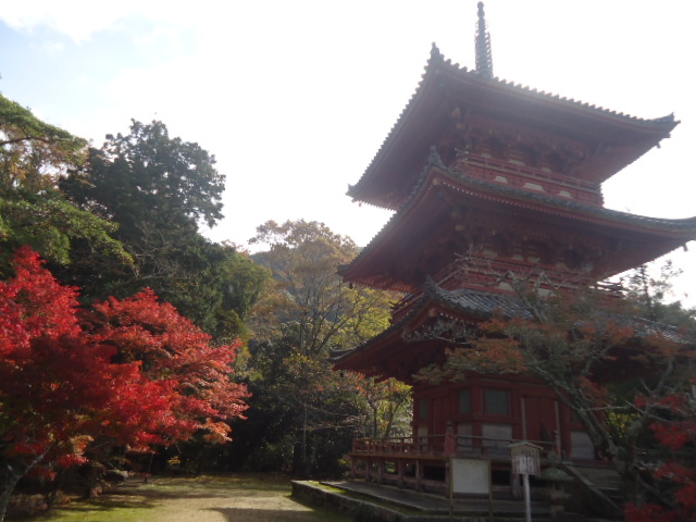 | 三重塔 各層の屋根の大きさがほぼ同じで、江戸時代中期の特徴をよく表しているという。建てられたのは1688年と考えられており、1964年に改装された。 案内説明板より |