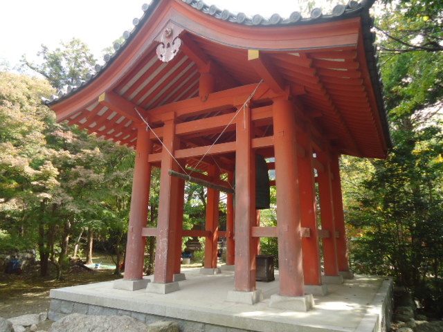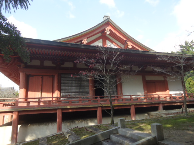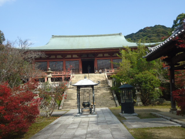 | 本堂 この本堂は、神戸市内の建造物の中で唯一の国宝に指定されている。1285年に焼失しましたが、1300年頃には再建された。太い大きな柱、力強い木組み、しかも簡素な外観は古い建築様式を伝えるとともに、広く大きな建物は寺の格式の高いことを示しています。 内部は御本尊の薬師如来を安置する内陣と礼拝する外陣とに区切られ、密教寺院の本堂形式になっています。 外部には、蔀戸(しとみど)が用いられており、上半分は外側に釣り上げ、下半分は取り外せます。昭和39年に、解体修理を行ったので鮮やかな色になっています。 案内説明板より |