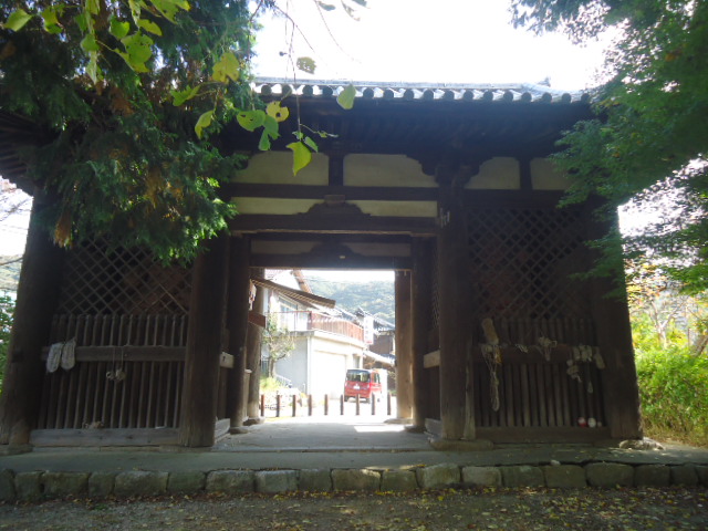 | 仁王門 他所にあったものを室町時代後期にここに移築されたものと考えられている。当初は三間一戸二層の堂々とした門でしたが、移築に際し、上層部を撤去し軒回りも縮小された。 案内説明板より |