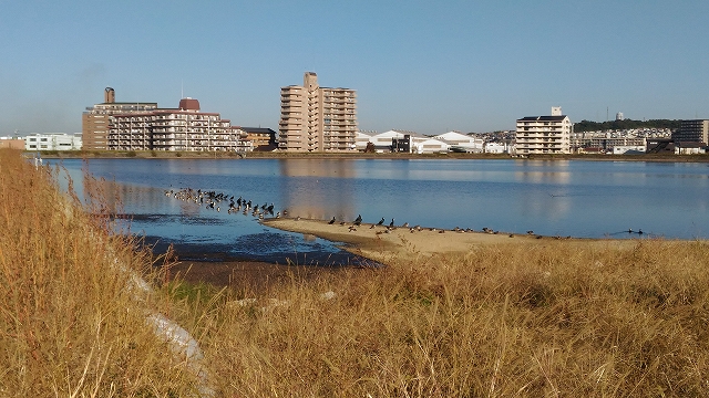 | 明石市最大のため池 「皿池」。 皿池は、もともと大きな一つのため池でしたが、国道250号線の開通によって東西の2つにわけられた。250号線を西進中。池には水鳥が多くいた。鴨と鵜のように見えたが。 |
