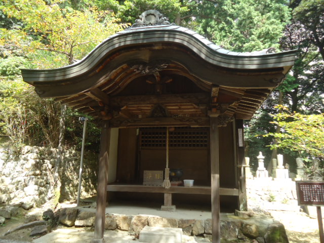 | 駐車場からの石門を過ぎると急峻な参道が続くが最初に目にするのが、地蔵堂。つっかい棒が気になって遠巻きにした。 |