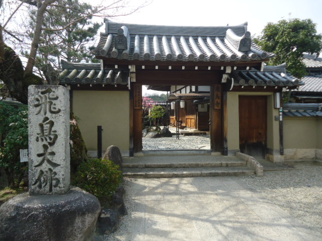 | 山門と飛鳥大仏標石 江戸時代の寛政4年(1792)飛鳥寺参拝の道しるべとして彫刻された優秀な文字で、台石は飛鳥寺創建時(588年)の礎石を用いている。 説明板より |